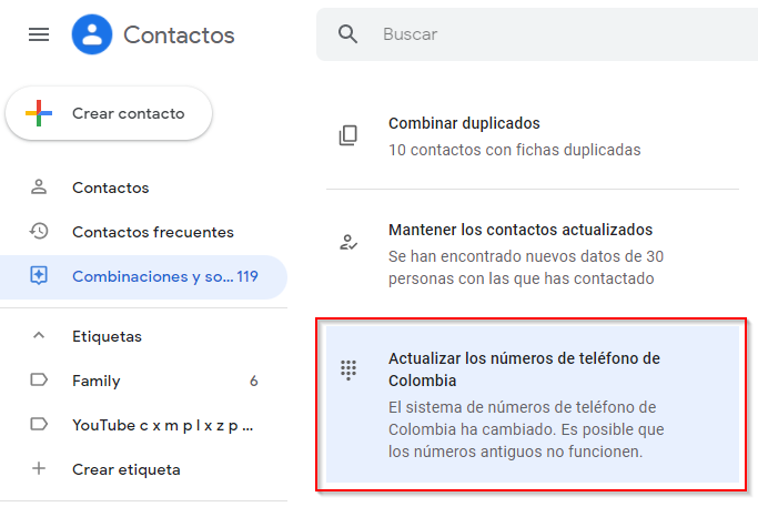 Clic en la tercera opción «Actualizar los números de teléfono de Colombia«
