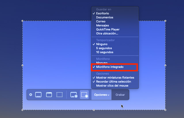 Micrófono: Para grabar la voz u otro audio junto a la grabación, hay que seleccionar esta opción.