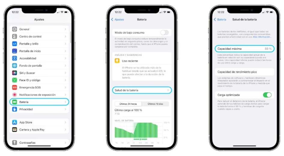 - En Capacidad máxima obtendrás el dato del estado de la batería.